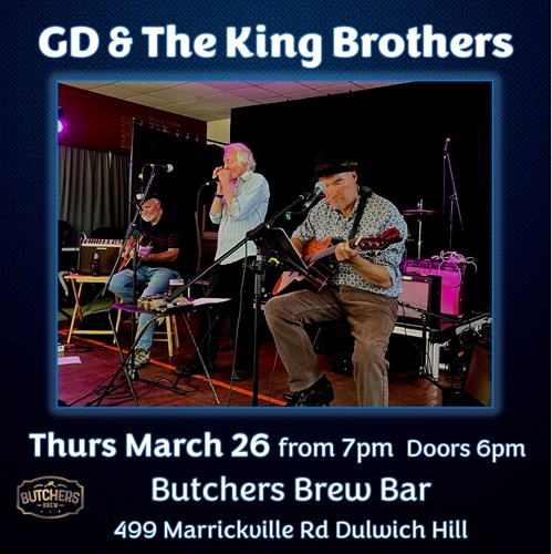 Thu, 26 Mar GD & THE KING BROTHERS - LIVE AT BUTCHERS BREW BAR! Butchers Brew Bar 499 Marrickville Rd, Dulwich Hill |