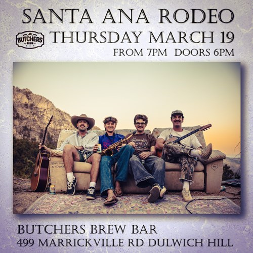 Thu, 19 Mar SANTA ANA RODEO (US) - LIVE AT BUTCHERS BREW BAR! Butchers Brew Bar 499 Marrickville Rd, Dulwich Hill |