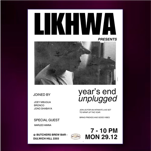 Mon, 29 Dec LIKHWA PRESENTS YEAR'S END UNPLUGGED - LIVE AT... Butchers Brew Bar 499 Marrickville Rd, Dulwich Hill |