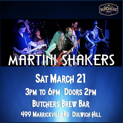 Sat, 21 Mar THE MARTINI SHAKERS - LIVE AT BUTCHERS BREW BAR! Butchers Brew Bar 499 Marrickville Rd, Dulwich Hill |