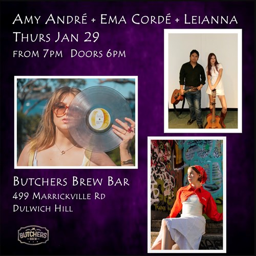 Thu, 29 Jan AMY ANDRĂ + EMA CORDĂ + LEIANNA (TRIPLE BILL) -... Butchers Brew Bar 499 Marrickville Rd, Dulwich Hill |