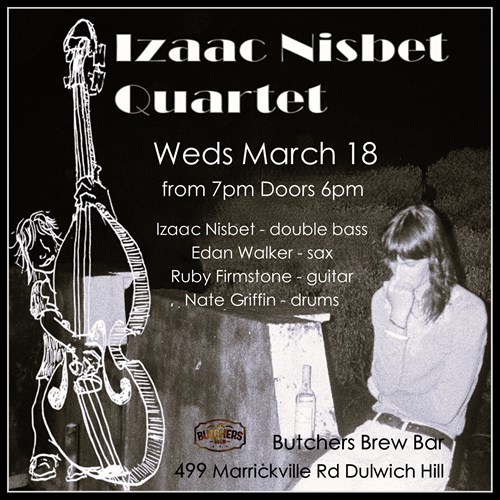 Wed, 18 Mar IZAAC NISBET QUARTET - LIVE AT BUTCHERS BREW BAR! Butchers Brew Bar 499 Marrickville Rd, Dulwich Hill |