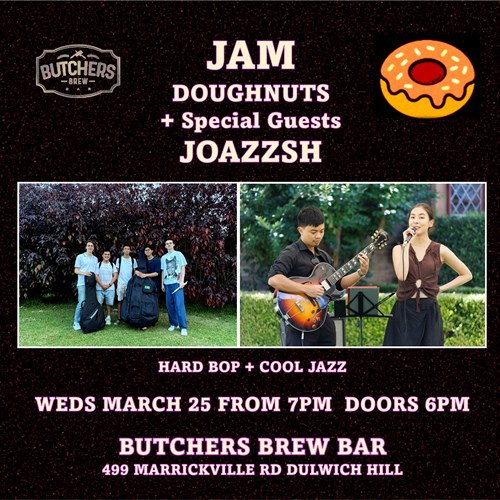 Wed, 25 Mar JAM DOUGHNUTS + JOAZZSH (DOUBLE BILL) - LIVE AT... Butchers Brew Bar 499 Marrickville Rd, Dulwich Hill |