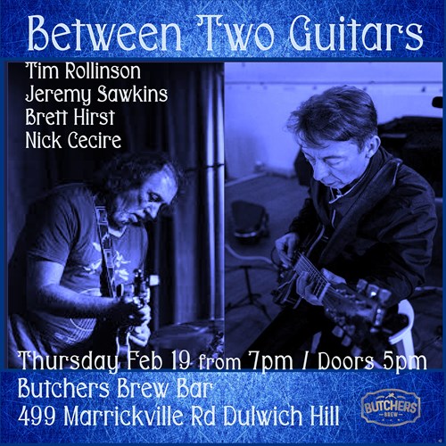 Thu, 19 Feb BETWEEN TWO GUITARS - LIVE AT BUTCHERS BREW BAR! Butchers Brew Bar 499 Marrickville Rd, Dulwich Hill |