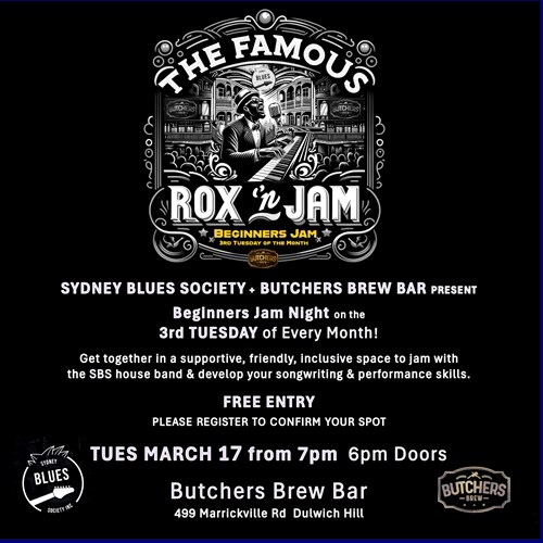 Tue, 17 Mar SYDNEY BLUES SOCIETY BEGINNERS JAM NIGHT - LIVE AT... Butchers Brew Bar 499 Marrickville Rd, Dulwich Hill |