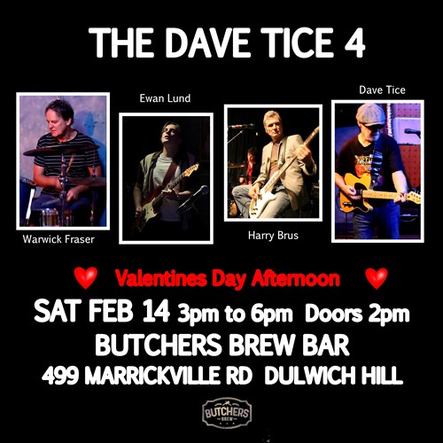 Sat, 14 Feb THE DAVE TICE 4 - LIVE AT BUTCHERS BREW BAR! Butchers Brew Bar 499 Marrickville Rd, Dulwich Hill |