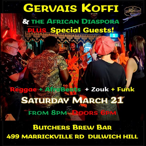 Sat, 21 Mar GERVAIS KOFFI & THE AFRICAN DIASPORA - LIVE AT... Butchers Brew Bar 499 Marrickville Rd, Dulwich Hill |