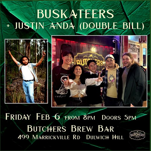 Fri, 6 Feb THE BUSKATEERS + JUSTIN ANDA (DOUBLE BILL) - LIVE... Butchers Brew Bar 499 Marrickville Rd, Dulwich Hill |
