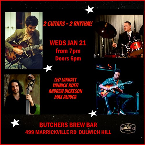Wed, 21 Jan 2 GUITARS + 2 RHYTHM - LIVE AT BUTCHERS BREW BAR! Butchers Brew Bar 499 Marrickville Rd, Dulwich Hill |
